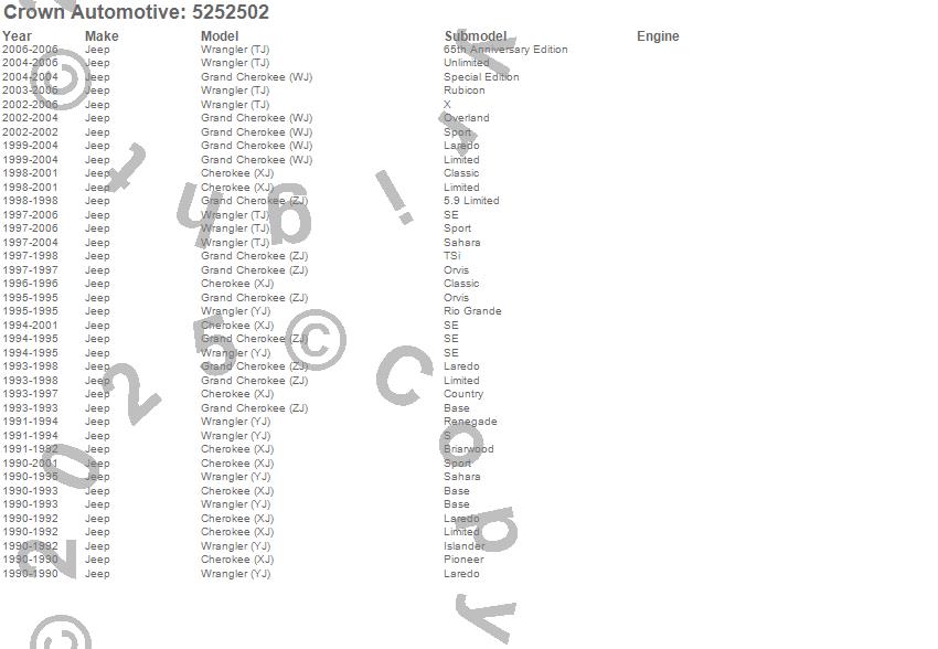 Cherokee (XJ), Grand Cherokee (WJ), Grand Cherokee (ZJ), Wrangler (LJ), Wrangler (TJ), Wrangler (YJ), Jeep, 2006, 2005, 2004, 2003, 2002, 2001, 2000, 1999, 1998, 1997, 1996, 1995, 1994 more…