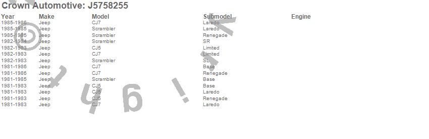Crown Automotive is the premier manufacturer and distributor of quality replacement parts for Jeep® CJ™, Wrangler™, Cherokee™, Grand Cherokee™, Liberty™, and Commander™."From humble beginnings in 1963 in a small Boston storefront, Crown Automotive has consistently maintained its commitment to offering only quality parts and exceptional service. Today, with warehouses in Massachusetts, Georgia, Nevada, Spain, and the Czech Republic, totaling over 160,000 square feet, Crown Automotive continues to be the leader in quality replacement parts for Jeep® vehicles. With over 8,000 different parts in stock for Jeep® vehicles from 1942 on up, Crown has the largest stock of replacement parts for Jeep® vehicles, including factory-discontinued parts. In fact, many of the older Jeeps are still on (and off) the road thanks to Crown parts. The Crown line consists of axle, body, brake, clutch, cooling, driveline, electrical, engine, exhaust, fuel, steering, suspension, transmission and transfer case components. Crown Automotive also offers an exclusive line of component kits and accessory products. Because we know that Jeeps are driven harder than most other vehicles, we emphasize offering only quality parts. In fact, we test parts on Jeeps before distributing them to our dealers to insure that they meet our standards for quality. Crown also supports its entire line with a 12 month/12,000 mile warranty to insure our dealers and their customers of our commitment to offering quality parts. We know from experience that Jeep® owners would rather pay a little more for a good quality part that's backed by a strong guarantee. But we know that price is important as well. So, not only will you find Crown parts to be of exceptional quality, but you'll find them at a great price too.