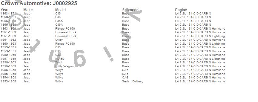 Crown Automotive is the premier manufacturer and distributor of quality replacement parts for Jeep® CJ™, Wrangler™, Cherokee™, Grand Cherokee™, Liberty™, and Commander™."From humble beginnings in 1963 in a small Boston storefront, Crown Automotive has consistently maintained its commitment to offering only quality parts and exceptional service. Today, with warehouses in Massachusetts, Georgia, Nevada, Spain, and the Czech Republic, totaling over 160,000 square feet, Crown Automotive continues to be the leader in quality replacement parts for Jeep® vehicles. With over 8,000 different parts in stock for Jeep® vehicles from 1942 on up, Crown has the largest stock of replacement parts for Jeep® vehicles, including factory-discontinued parts. In fact, many of the older Jeeps are still on (and off) the road thanks to Crown parts. The Crown line consists of axle, body, brake, clutch, cooling, driveline, electrical, engine, exhaust, fuel, steering, suspension, transmission and transfer case components. Crown Automotive also offers an exclusive line of component kits and accessory products. Because we know that Jeeps are driven harder than most other vehicles, we emphasize offering only quality parts. In fact, we test parts on Jeeps before distributing them to our dealers to insure that they meet our standards for quality. Crown also supports its entire line with a 12 month/12,000 mile warranty to insure our dealers and their customers of our commitment to offering quality parts. We know from experience that Jeep® owners would rather pay a little more for a good quality part that's backed by a strong guarantee. But we know that price is important as well. So, not only will you find Crown parts to be of exceptional quality, but you'll find them at a great price too.