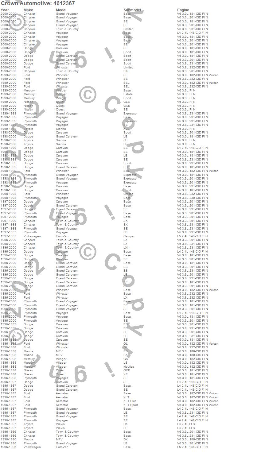 Aerostar, Caravan, EuroVan, Grand Caravan, Grand Voyager, MPV, Previa, Quest, Sienna, Town & Country, Villager, Voyager, Windstar, Chrysler, Dodge, Ford, Mazda, Mercury, Nissan, Plymouth more…