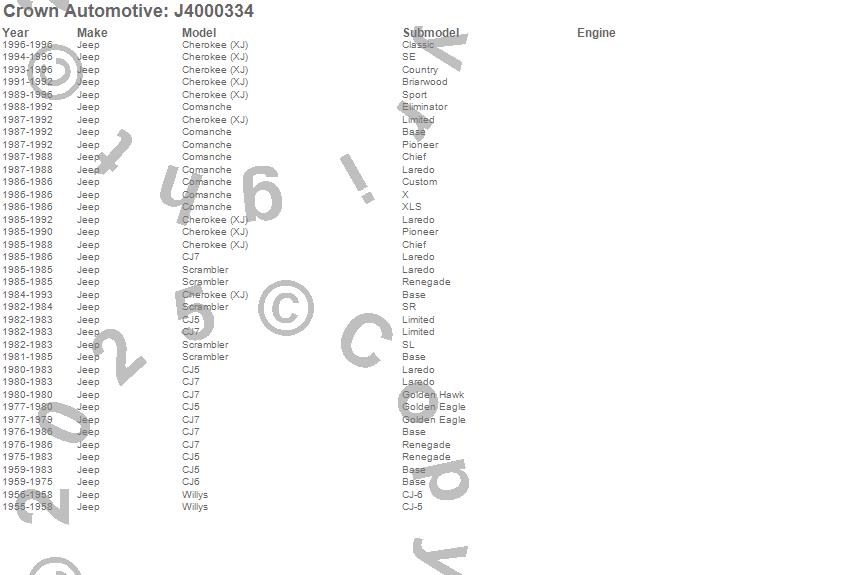Crown Automotive is the premier manufacturer and distributor of quality replacement parts for Jeep® CJ™, Wrangler™, Cherokee™, Grand Cherokee™, Liberty™, and Commander™."From humble beginnings in 1963 in a small Boston storefront, Crown Automotive has consistently maintained its commitment to offering only quality parts and exceptional service. Today, with warehouses in Massachusetts, Georgia, Nevada, Spain, and the Czech Republic, totaling over 160,000 square feet, Crown Automotive continues to be the leader in quality replacement parts for Jeep® vehicles. With over 8,000 different parts in stock for Jeep® vehicles from 1942 on up, Crown has the largest stock of replacement parts for Jeep® vehicles, including factory-discontinued parts. In fact, many of the older Jeeps are still on (and off) the road thanks to Crown parts. The Crown line consists of axle, body, brake, clutch, cooling, driveline, electrical, engine, exhaust, fuel, steering, suspension, transmission and transfer case components. Crown Automotive also offers an exclusive line of component kits and accessory products. Because we know that Jeeps are driven harder than most other vehicles, we emphasize offering only quality parts. In fact, we test parts on Jeeps before distributing them to our dealers to insure that they meet our standards for quality. Crown also supports its entire line with a 12 month/12,000 mile warranty to insure our dealers and their customers of our commitment to offering quality parts. We know from experience that Jeep® owners would rather pay a little more for a good quality part that's backed by a strong guarantee. But we know that price is important as well. So, not only will you find Crown parts to be of exceptional quality, but you'll find them at a great price too.