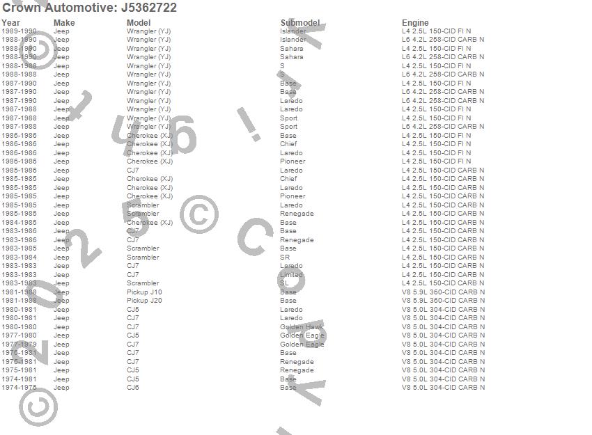 Crown Automotive is the premier manufacturer and distributor of quality replacement parts for Jeep® CJ™, Wrangler™, Cherokee™, Grand Cherokee™, Liberty™, and Commander™."From humble beginnings in 1963 in a small Boston storefront, Crown Automotive has consistently maintained its commitment to offering only quality parts and exceptional service. Today, with warehouses in Massachusetts, Georgia, Nevada, Spain, and the Czech Republic, totaling over 160,000 square feet, Crown Automotive continues to be the leader in quality replacement parts for Jeep® vehicles. With over 8,000 different parts in stock for Jeep® vehicles from 1942 on up, Crown has the largest stock of replacement parts for Jeep® vehicles, including factory-discontinued parts. In fact, many of the older Jeeps are still on (and off) the road thanks to Crown parts. The Crown line consists of axle, body, brake, clutch, cooling, driveline, electrical, engine, exhaust, fuel, steering, suspension, transmission and transfer case components. Crown Automotive also offers an exclusive line of component kits and accessory products. Because we know that Jeeps are driven harder than most other vehicles, we emphasize offering only quality parts. In fact, we test parts on Jeeps before distributing them to our dealers to insure that they meet our standards for quality. Crown also supports its entire line with a 12 month/12,000 mile warranty to insure our dealers and their customers of our commitment to offering quality parts. We know from experience that Jeep® owners would rather pay a little more for a good quality part that's backed by a strong guarantee. But we know that price is important as well. So, not only will you find Crown parts to be of exceptional quality, but you'll find them at a great price too.