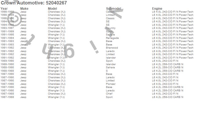 Crown Automotive is the premier manufacturer and distributor of quality replacement parts for Jeep® CJ™, Wrangler™, Cherokee™, Grand Cherokee™, Liberty™, and Commander™."From humble beginnings in 1963 in a small Boston storefront, Crown Automotive has consistently maintained its commitment to offering only quality parts and exceptional service. Today, with warehouses in Massachusetts, Georgia, Nevada, Spain, and the Czech Republic, totaling over 160,000 square feet, Crown Automotive continues to be the leader in quality replacement parts for Jeep® vehicles. With over 8,000 different parts in stock for Jeep® vehicles from 1942 on up, Crown has the largest stock of replacement parts for Jeep® vehicles, including factory-discontinued parts. In fact, many of the older Jeeps are still on (and off) the road thanks to Crown parts. The Crown line consists of axle, body, brake, clutch, cooling, driveline, electrical, engine, exhaust, fuel, steering, suspension, transmission and transfer case components. Crown Automotive also offers an exclusive line of component kits and accessory products. Because we know that Jeeps are driven harder than most other vehicles, we emphasize offering only quality parts. In fact, we test parts on Jeeps before distributing them to our dealers to insure that they meet our standards for quality. Crown also supports its entire line with a 12 month/12,000 mile warranty to insure our dealers and their customers of our commitment to offering quality parts. We know from experience that Jeep® owners would rather pay a little more for a good quality part that's backed by a strong guarantee. But we know that price is important as well. So, not only will you find Crown parts to be of exceptional quality, but you'll find them at a great price too.