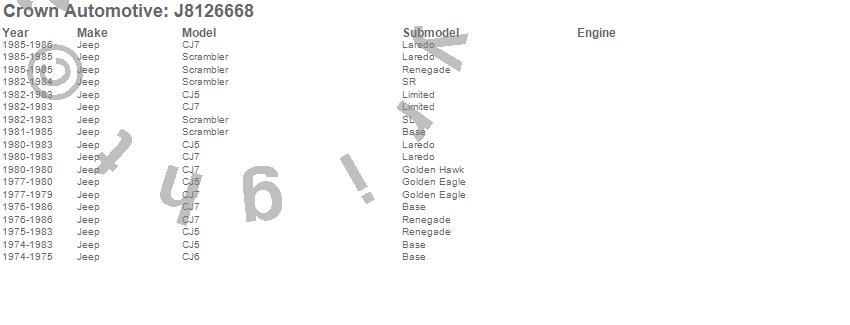 Crown Automotive is the premier manufacturer and distributor of quality replacement parts for Jeep® CJ™, Wrangler™, Cherokee™, Grand Cherokee™, Liberty™, and Commander™."From humble beginnings in 1963 in a small Boston storefront, Crown Automotive has consistently maintained its commitment to offering only quality parts and exceptional service. Today, with warehouses in Massachusetts, Georgia, Nevada, Spain, and the Czech Republic, totaling over 160,000 square feet, Crown Automotive continues to be the leader in quality replacement parts for Jeep® vehicles. With over 8,000 different parts in stock for Jeep® vehicles from 1942 on up, Crown has the largest stock of replacement parts for Jeep® vehicles, including factory-discontinued parts. In fact, many of the older Jeeps are still on (and off) the road thanks to Crown parts. The Crown line consists of axle, body, brake, clutch, cooling, driveline, electrical, engine, exhaust, fuel, steering, suspension, transmission and transfer case components. Crown Automotive also offers an exclusive line of component kits and accessory products. Because we know that Jeeps are driven harder than most other vehicles, we emphasize offering only quality parts. In fact, we test parts on Jeeps before distributing them to our dealers to insure that they meet our standards for quality. Crown also supports its entire line with a 12 month/12,000 mile warranty to insure our dealers and their customers of our commitment to offering quality parts. We know from experience that Jeep® owners would rather pay a little more for a good quality part that's backed by a strong guarantee. But we know that price is important as well. So, not only will you find Crown parts to be of exceptional quality, but you'll find them at a great price too.