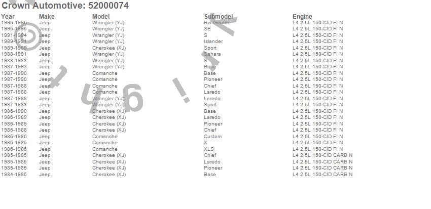 Crown Automotive is the premier manufacturer and distributor of quality replacement parts for Jeep® CJ™, Wrangler™, Cherokee™, Grand Cherokee™, Liberty™, and Commander™."From humble beginnings in 1963 in a small Boston storefront, Crown Automotive has consistently maintained its commitment to offering only quality parts and exceptional service. Today, with warehouses in Massachusetts, Georgia, Nevada, Spain, and the Czech Republic, totaling over 160,000 square feet, Crown Automotive continues to be the leader in quality replacement parts for Jeep® vehicles. With over 8,000 different parts in stock for Jeep® vehicles from 1942 on up, Crown has the largest stock of replacement parts for Jeep® vehicles, including factory-discontinued parts. In fact, many of the older Jeeps are still on (and off) the road thanks to Crown parts. The Crown line consists of axle, body, brake, clutch, cooling, driveline, electrical, engine, exhaust, fuel, steering, suspension, transmission and transfer case components. Crown Automotive also offers an exclusive line of component kits and accessory products. Because we know that Jeeps are driven harder than most other vehicles, we emphasize offering only quality parts. In fact, we test parts on Jeeps before distributing them to our dealers to insure that they meet our standards for quality. Crown also supports its entire line with a 12 month/12,000 mile warranty to insure our dealers and their customers of our commitment to offering quality parts. We know from experience that Jeep® owners would rather pay a little more for a good quality part that's backed by a strong guarantee. But we know that price is important as well. So, not only will you find Crown parts to be of exceptional quality, but you'll find them at a great price too.