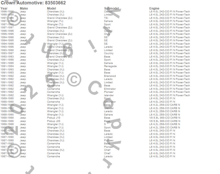 Cherokee (XJ), Comanche, Grand Cherokee (ZJ), J10, J20, Wrangler (TJ), Wrangler (YJ), Jeep, 1998, 1997, 1996, 1995, 1994, 1993, 1992, 1991, 1990, 1989, 1988, 1987 more…