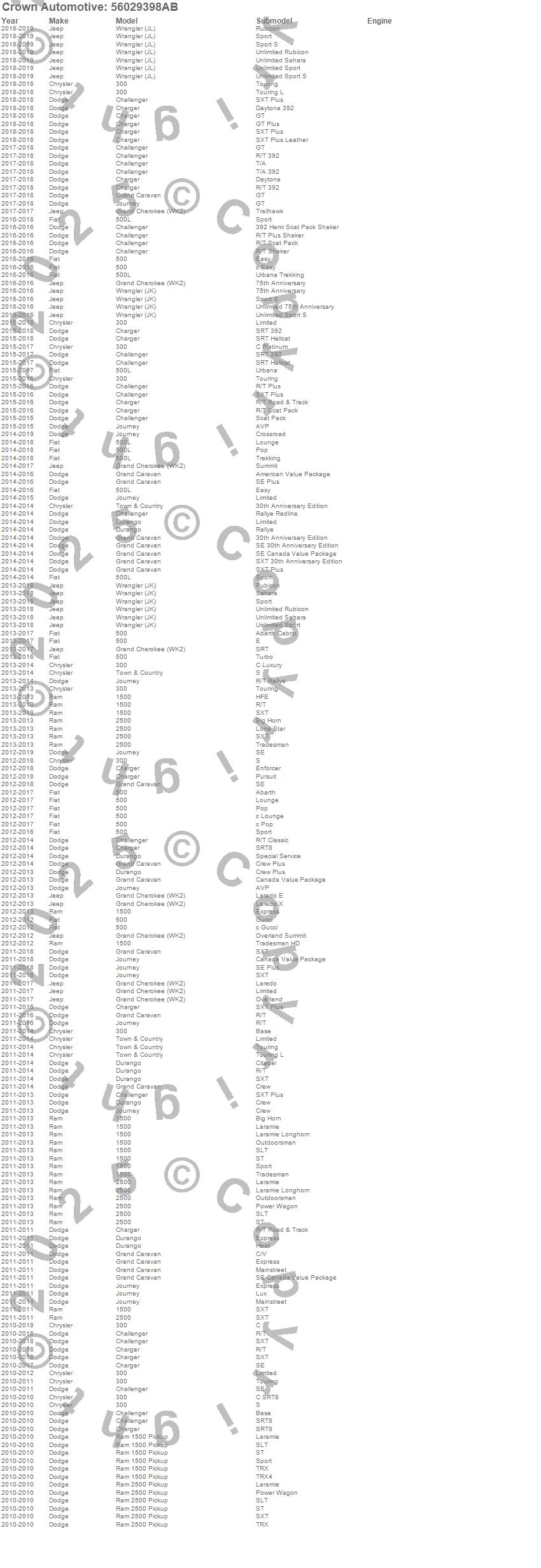 1500, 2500, 300, 3500, 500, 500L, Challenger, Charger, Durango, Grand Caravan, Grand Cherokee (WK2), Journey, Ram 1500, Ram 2500, Ram 3500, Town & Country, Wrangler (JK), Chrysler, Dodge, Fiat more…