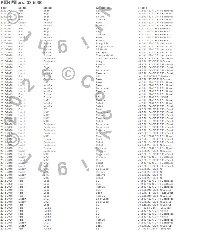 Below is an abreviated list of applications for the Air Filter.