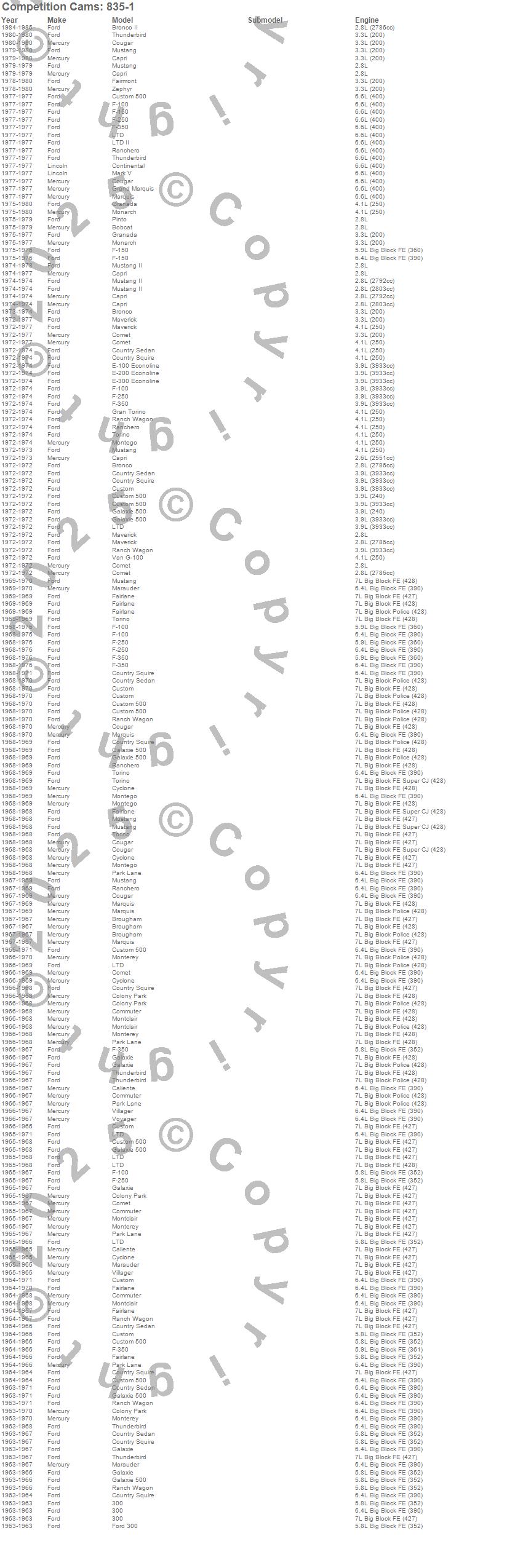 Bobcat, Breezeway, Bronco II, Brougham, Caliente, Capri, Colony Park, Comet, Commuter, Cougar, Country Sedan, Country Squire, Custom, Custom 500, Cyclone, F-100, F-150, F-250, F-350, Fairlane more…