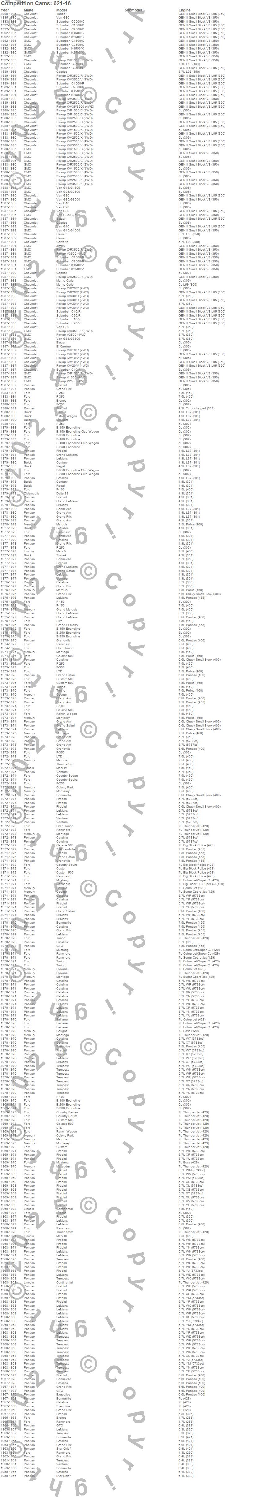 Blazer, Bonneville, Bronco, C1500, C1500 Pickup, C1500 Suburban, C2500 Pickup, C2500 Suburban, C3500 Pickup, Camaro, Caprice, Catalina, Catalina Ventura, Century, Club Cargo, Colony Park, Continental, Corvette, Cougar, Country Sedan more…