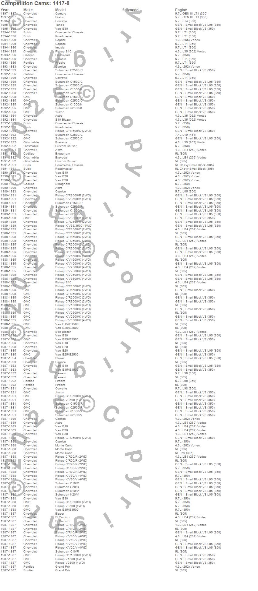 Blazer, C1500, C1500 Pickup, C1500 Suburban, C2500 Pickup, C2500 Suburban, C3500 Pickup, Camaro, Caprice, Commercial Chassis, Corvette, El Camino, Firebird, Fleetwood, G10, G10 Van, G15/G1500 Van, G20, G20 Van, G25/G2500 Van more…