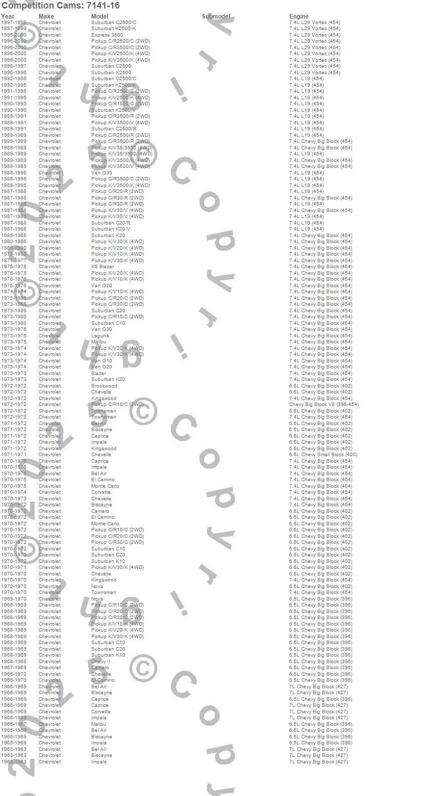 Bel Air, Biscayne, Blazer, Blazer K5, Brookwood, C10 Pickup, C10 Suburban, C1500, C1500 Pickup, C20 Pickup, C20 Suburban, C2500 Pickup, C2500 Suburban, C30 Pickup, C3500 Pickup, Camaro, Caprice, Chevelle, Chevy II, Corvette more…