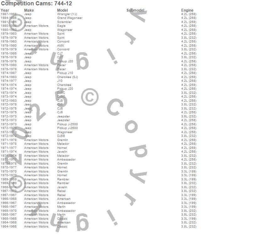 Ambassador, American, AMX, Cherokee (SJ), CJ5, CJ6, CJ7, Classic, Concord, DJ5B, DJ5C, Eagle, Grand Wagoneer, Gremlin, Hornet, J-2500, J-2600, J10, J20, Javelin more…