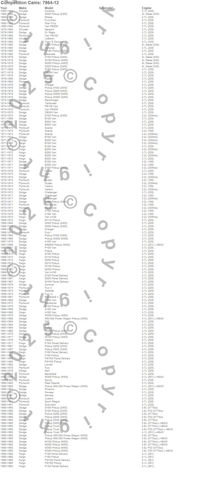 A100 Truck, A100 Van, A108 Van, Aspen, B100 Van, B200 Van, B300 Van, Barracuda, Belvedere, Belvedere II, CB300 Van, Challenger, Charger, Cordoba, Coronet, Custom, D100 Pickup, D150 Pickup, D200 Pickup, D200 Series more…