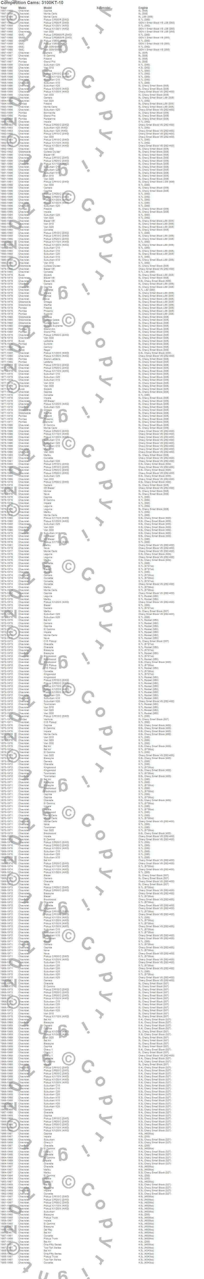 Bel Air, Biscayne, Blazer, Blazer K5, Bonneville, Brookwood, C10 Pickup, C10 Suburban, C20 Pickup, C20 Suburban, C30 Pickup, Camaro, Caprice, Century, Chevelle, Chevy II, Corvette, Cutlass, Cutlass Calais, Cutlass Cruiser more…