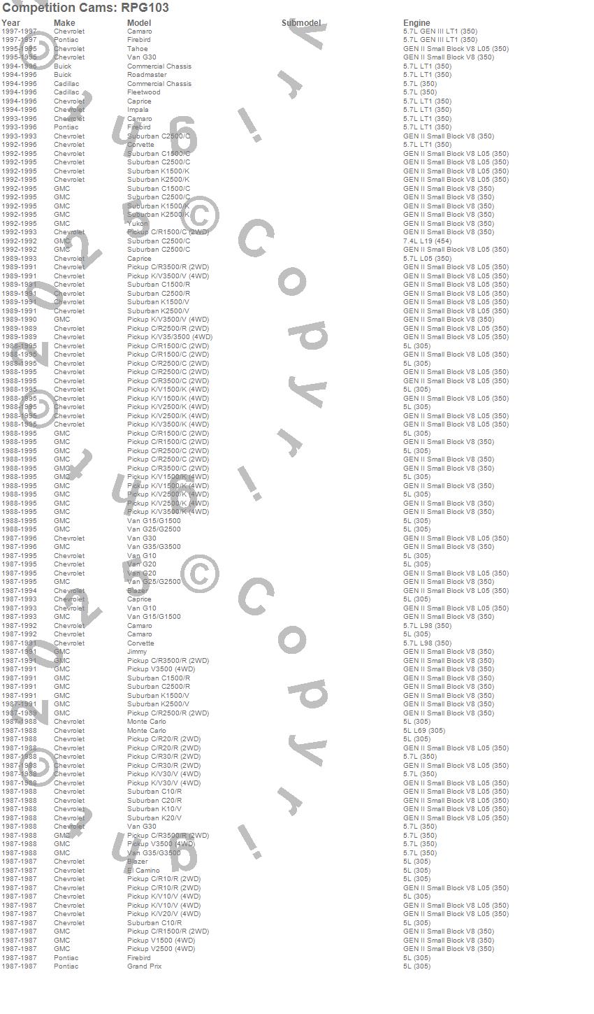Blazer, C1500, C1500 Pickup, C1500 Suburban, C2500 Pickup, C2500 Suburban, C3500 Pickup, Camaro, Caprice, Commercial Chassis, Corvette, El Camino, Firebird, Fleetwood, G10, G10 Van, G15/G1500 Van, G20, G20 Van, G25/G2500 Van more…