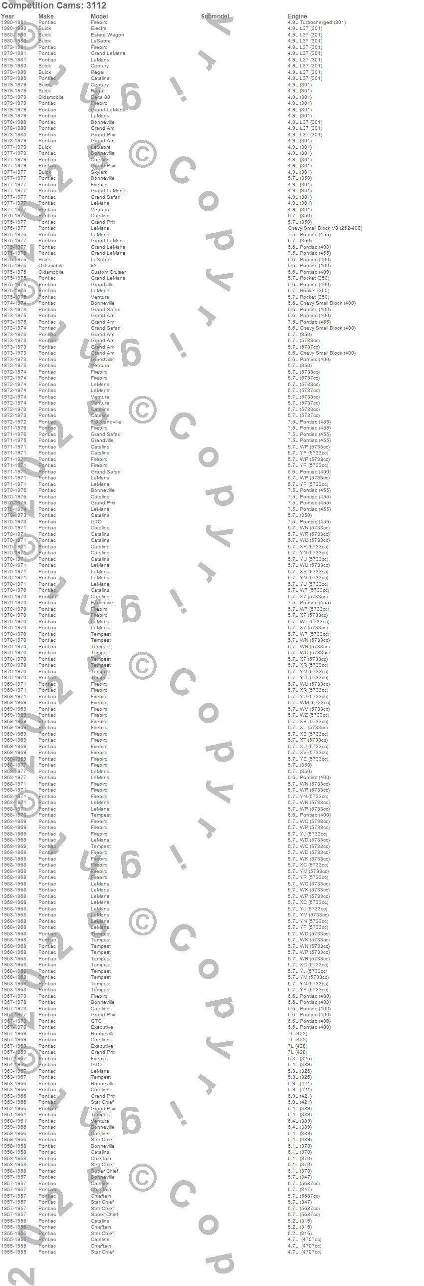 98, Bonneville, Catalina, Catalina Ventura, Century, Chieftain, Custom Cruiser, Delta 88, Electra, Estate Wagon, Executive, Firebird, Firebird Trans Am, Grand Am, Grand LeMans, Grand Prix, Grand Safari, Grandville, GTO, LeMans more…