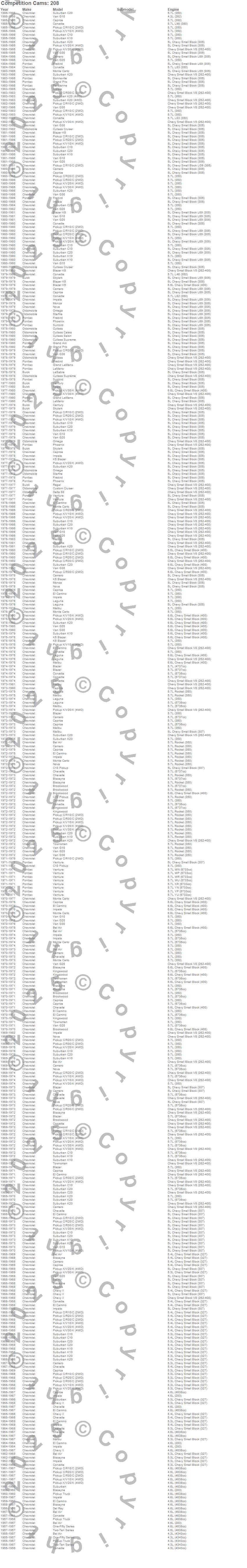 Bel Air, Biscayne, Blazer, Blazer K5, Bonneville, Brookwood, C10 Pickup, C10 Suburban, C20 Pickup, C20 Suburban, C30 Pickup, Camaro, Caprice, Century, Chevelle, Chevy II, Corvette, Custom Cruiser, Cutlass, Cutlass Calais more…