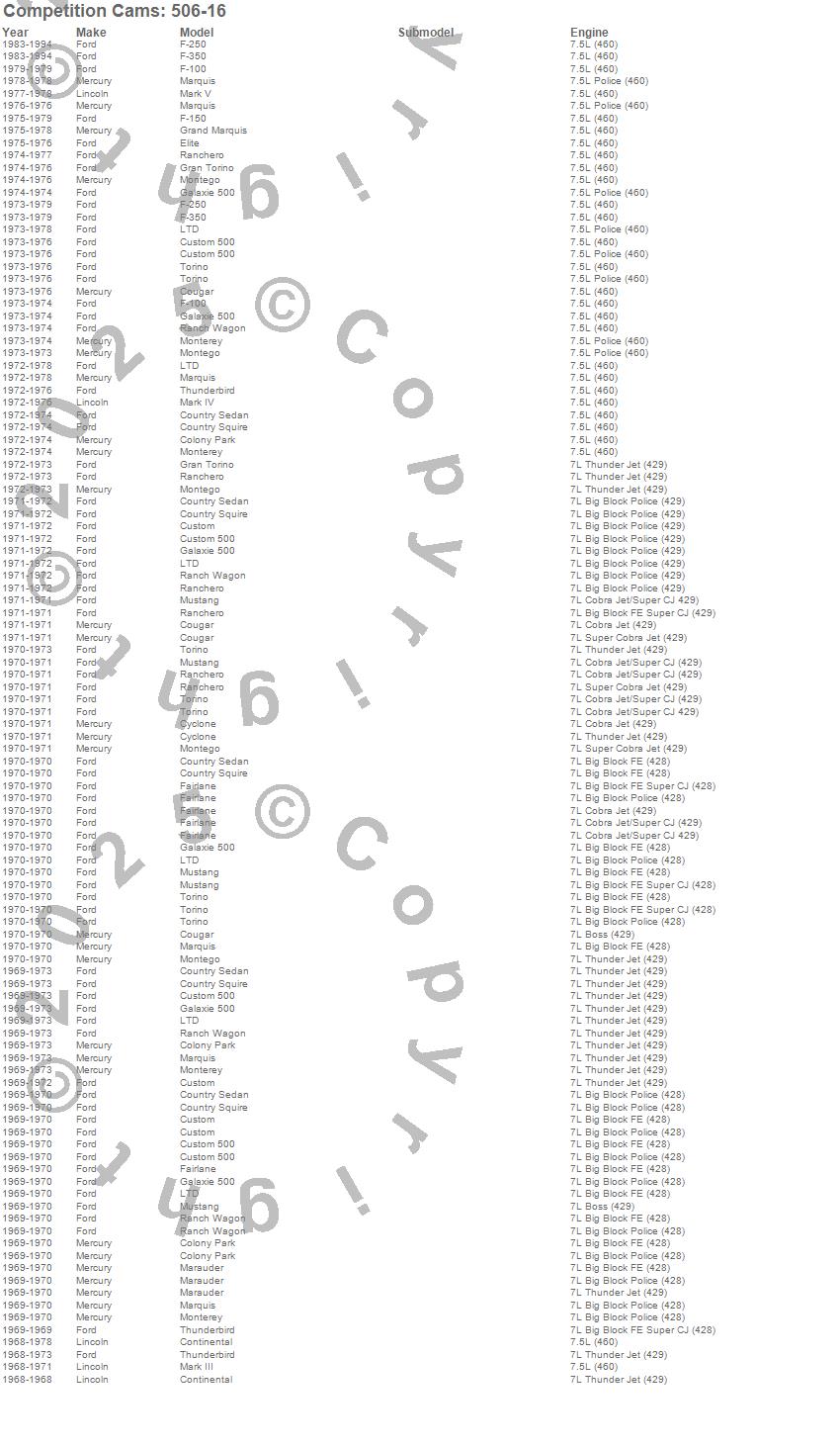 Colony Park, Continental, Cougar, Country Sedan, Country Squire, Custom, Custom 500, Cyclone, Elite, F-100, F-150, F-250, F-350, Fairlane, Galaxie 500, Gran Torino, Grand Marquis, LTD, Marauder, Mark III more…