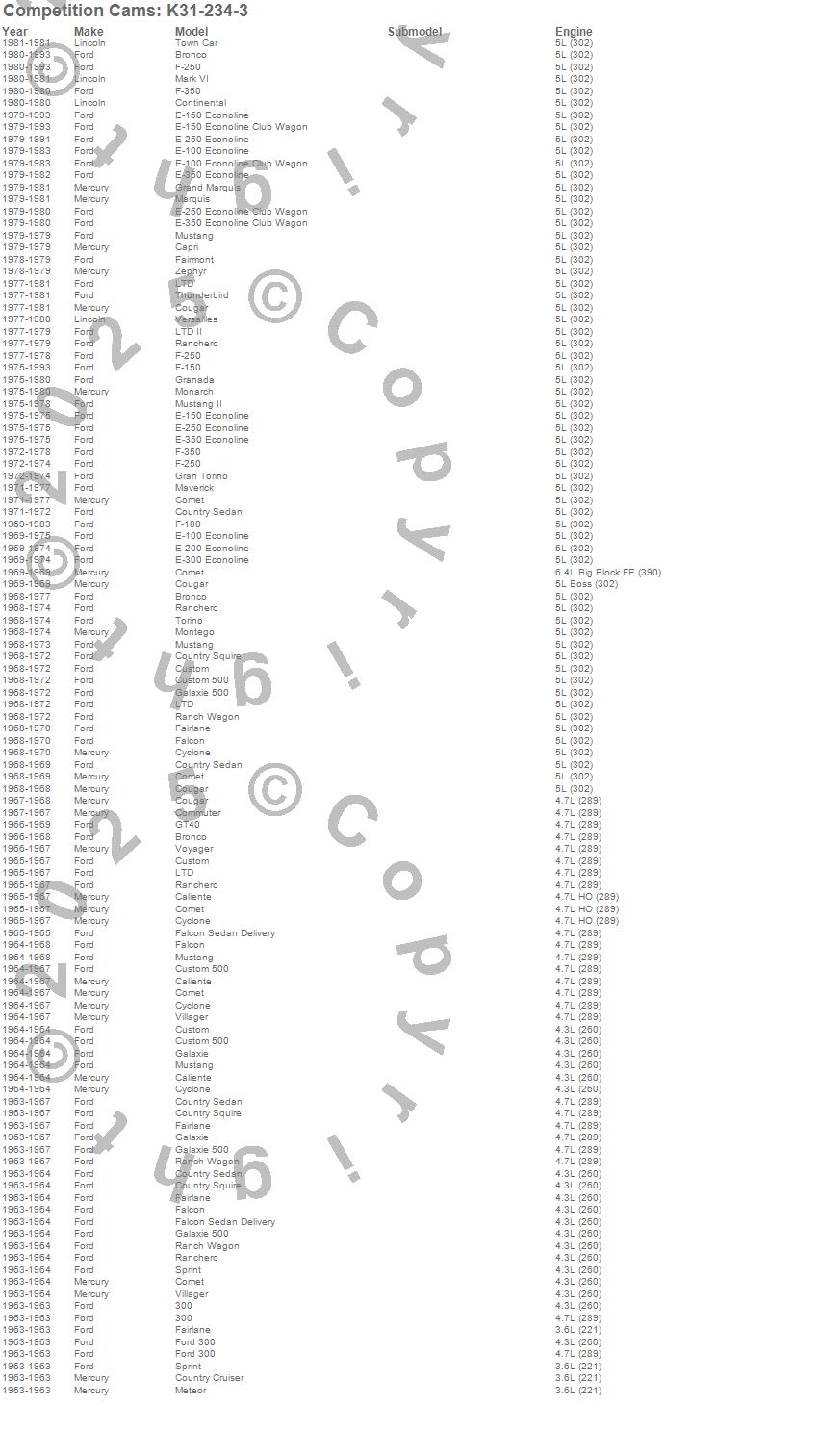 Bronco, Caliente, Capri, Club Cargo, Comet, Commuter, Continental, Cougar, Country Cruiser, Country Sedan, Country Squire, Custom, Custom 500, Cyclone, E-100 Econoline, E-150 Econoline, E-150 Econoline Club Wagon, E-200 Econoline, E-250 Econoline, E-300 Econoline more…