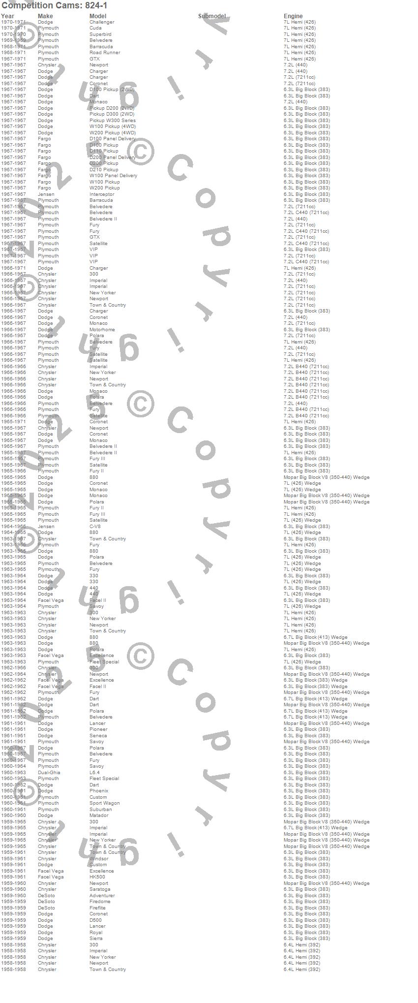 300, 330, 440, 880, Barracuda, Belvedere, Belvedere II, Challenger, Charger, Coronet, Cuda, Custom, D100 Pickup, D200 Series, D300 Series, Dart, Fleet Special, Fury, Fury II, Fury III more…