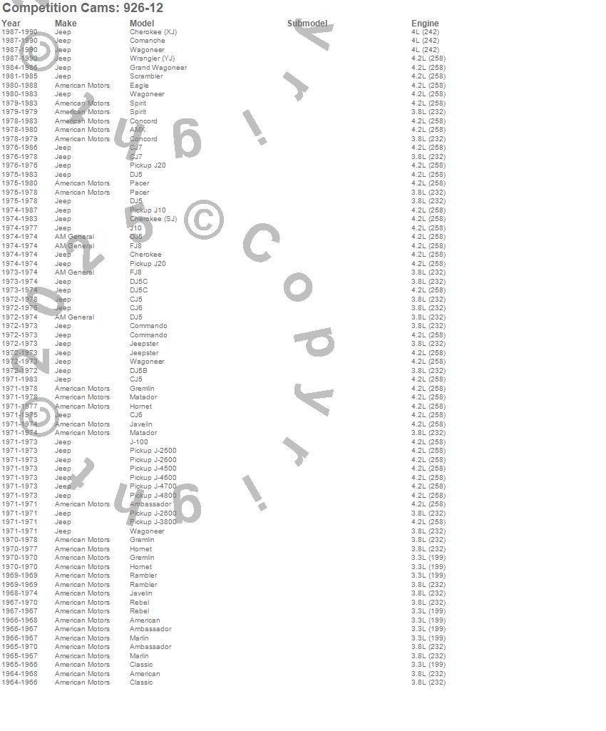 Ambassador, American, AMX, Cherokee (SJ), CJ5, CJ6, CJ7, Classic, Concord, DJ5B, DJ5C, Eagle, Grand Wagoneer, Gremlin, Hornet, J-2500, J-2600, J10, J20, Javelin more…