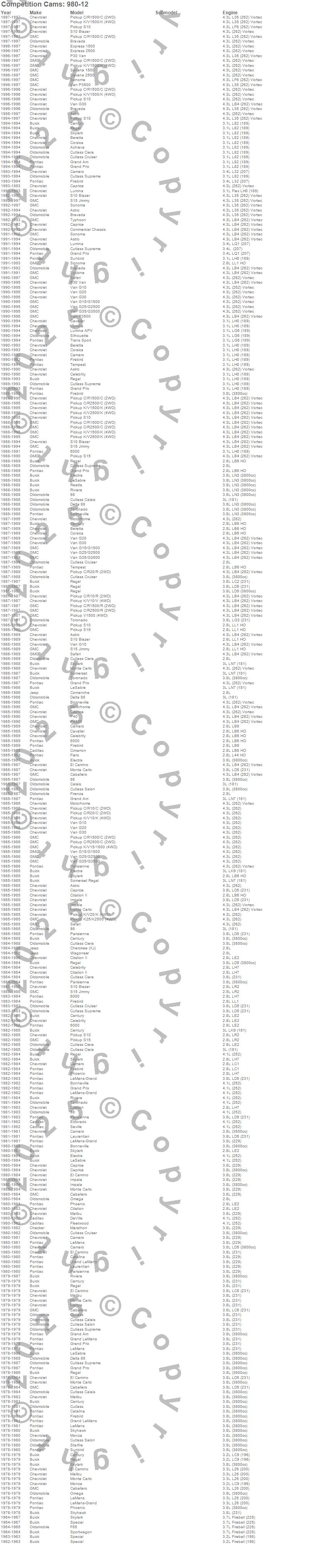 Astro, Beretta, Bonneville, C10 Pickup, C20 Pickup, Camaro, Caprice, Catalina, Cavalier, Celebrity, Century, Citation, Citation II, Corsica, Cutlass, Cutlass Supreme, Delta 88, El Camino, Electra, Firebird more…
