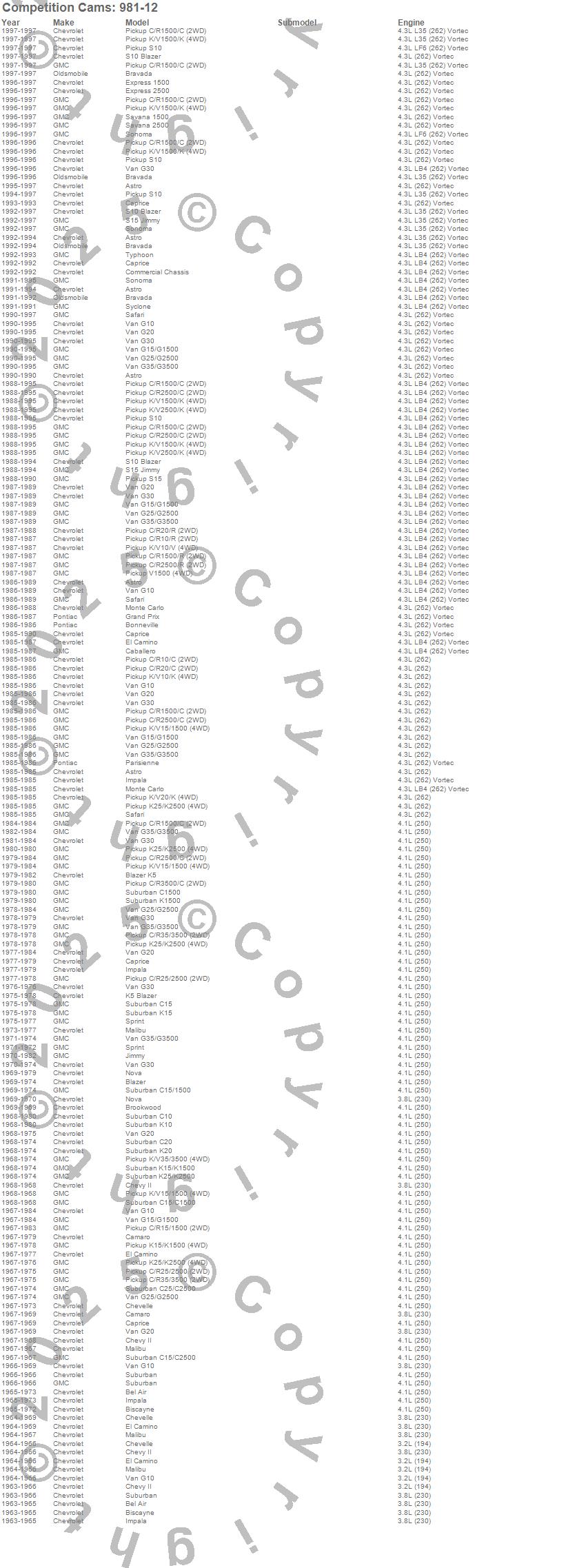 Bel Air, Biscayne, Blazer, Blazer K5, Brookwood, C10 Suburban, C15 Suburban, C15/C1500, C15/C1500 Suburban, C1500, C1500 Suburban, C20 Suburban, C25/C2500 Pickup, C25/C2500 Suburban, C2500 Pickup, C35/C3500 Pickup, C3500 Pickup, Camaro, Caprice, Chevelle more…