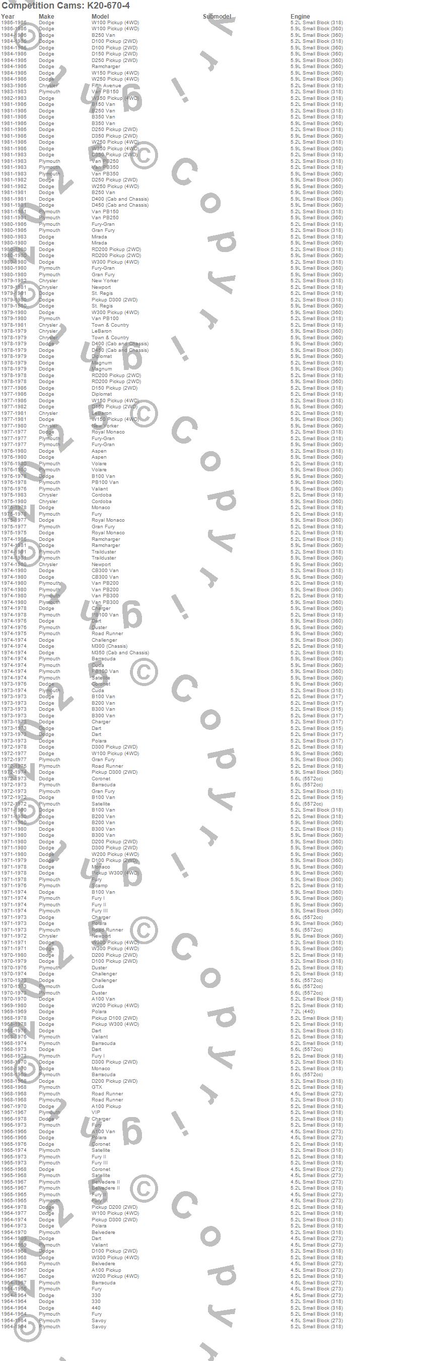 Below is an abreviated list of applications for the Nostalgia/Purple Plus Camshaft Kit.
