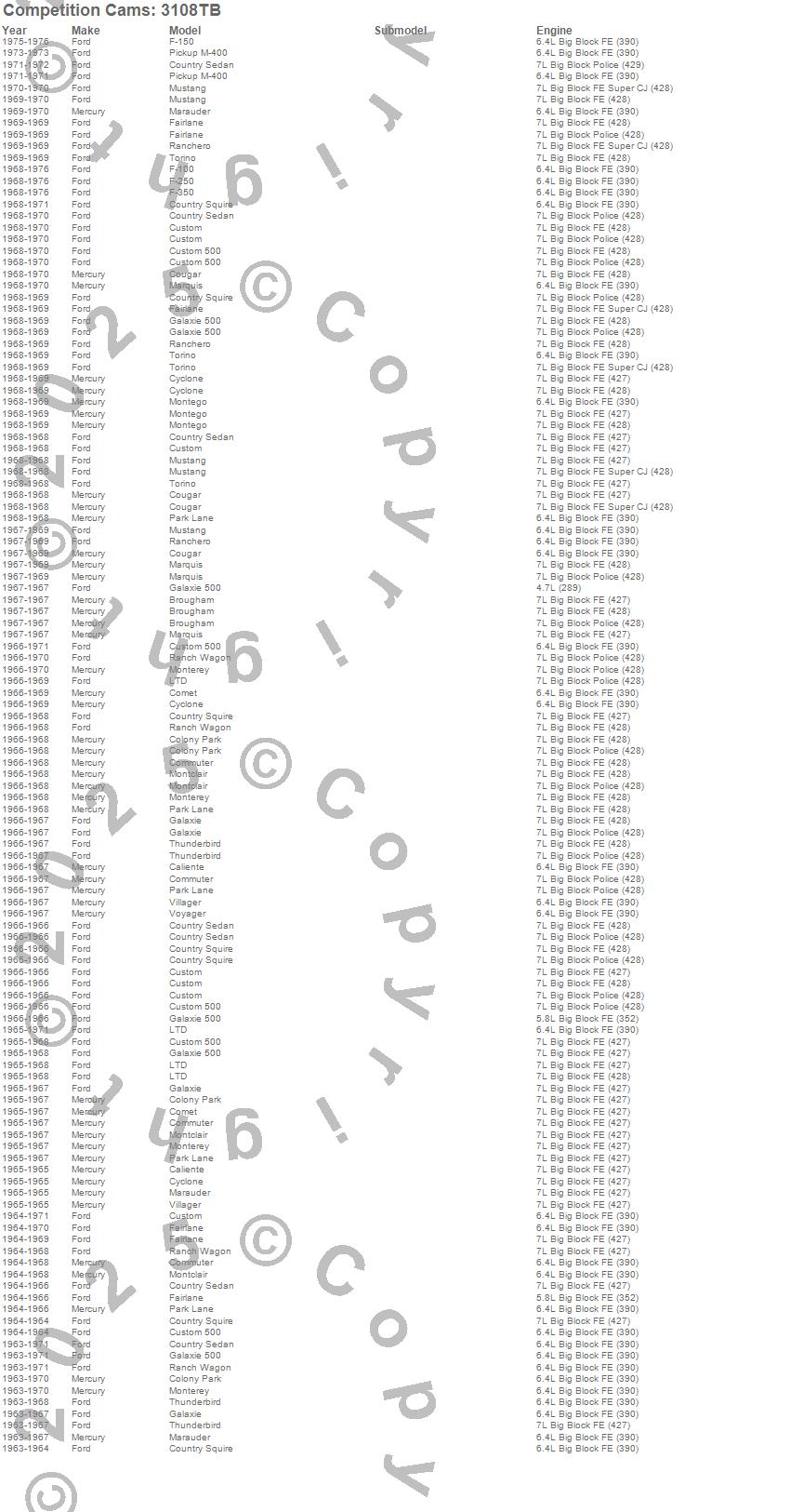 Breezeway, Brougham, Caliente, Colony Park, Comet, Commuter, Cougar, Country Sedan, Country Squire, Custom, Custom 500, Cyclone, F-100, F-150, F-250, F-350, Fairlane, Galaxie, Galaxie 500, LTD more…