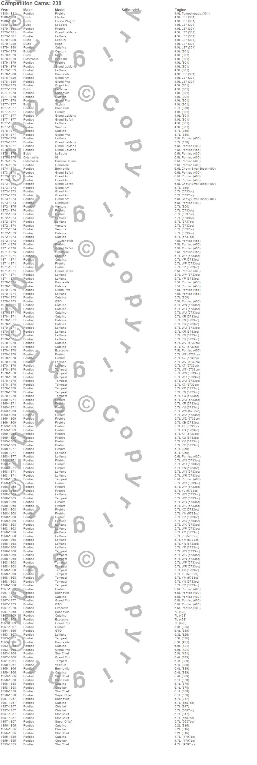 98, Bonneville, Catalina, Catalina Ventura, Century, Chieftain, Custom Cruiser, Delta 88, Electra, Estate Wagon, Executive, Firebird, Firebird Trans Am, Grand Am, Grand LeMans, Grand Prix, Grand Safari, Grandville, GTO, LeMans more…