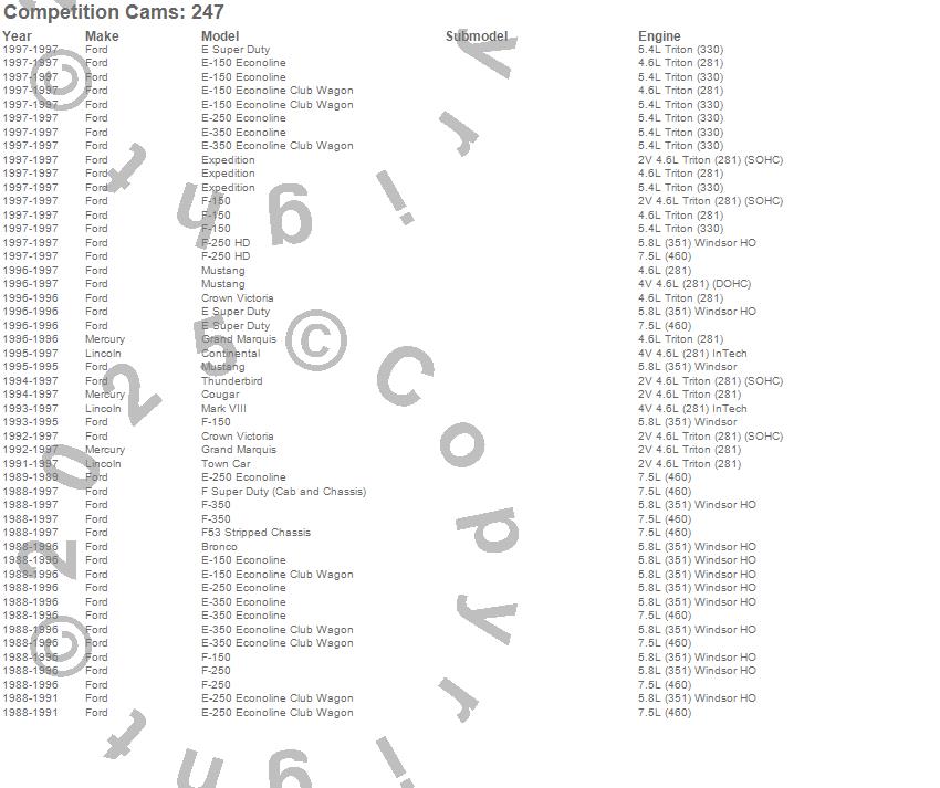 Bronco, Continental, Cougar, Crown Victoria, E Super Duty, E-150 Econoline, E-150 Econoline Club Wagon, E-250 Econoline, E-250 Econoline Club Wagon, E-350 Econoline, E-350 Econoline Club Wagon, Expedition, F Super Duty, F-150, F-250, F-350, F53, Grand Marquis, Mark VIII, Mustang more…
