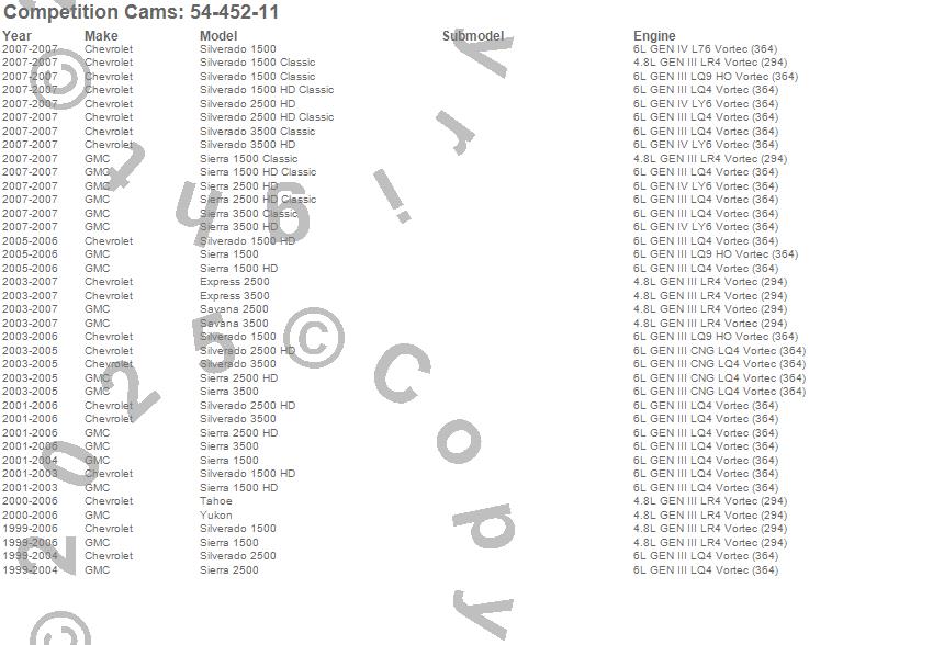 Below is an abreviated list of applications for the XFI Xtreme Truck Fuel Injection Camshaft.