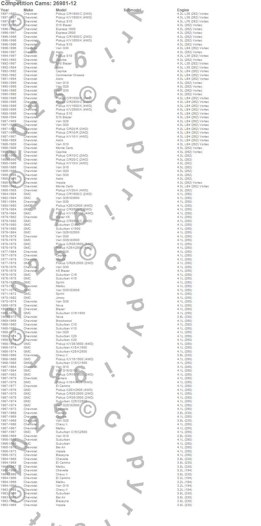 Bel Air, Biscayne, Blazer, Blazer K5, Brookwood, C10 Suburban, C15 Suburban, C15/C1500, C15/C1500 Suburban, C1500, C1500 Suburban, C20 Suburban, C25/C2500 Pickup, C25/C2500 Suburban, C2500 Pickup, C35/C3500 Pickup, C3500 Pickup, Camaro, Caprice, Chevelle more…