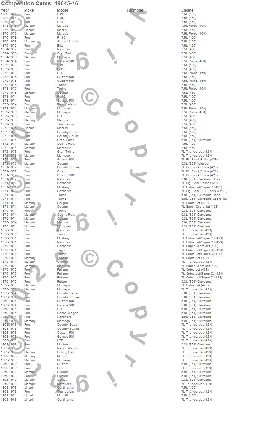Colony Park, Continental, Cougar, Country Sedan, Country Squire, Custom, Custom 500, Cyclone, Elite, F-100, F-150, F-250, F-350, Fairlane, Galaxie 500, Gran Torino, Grand Marquis, LTD, Marauder, Mark III more…