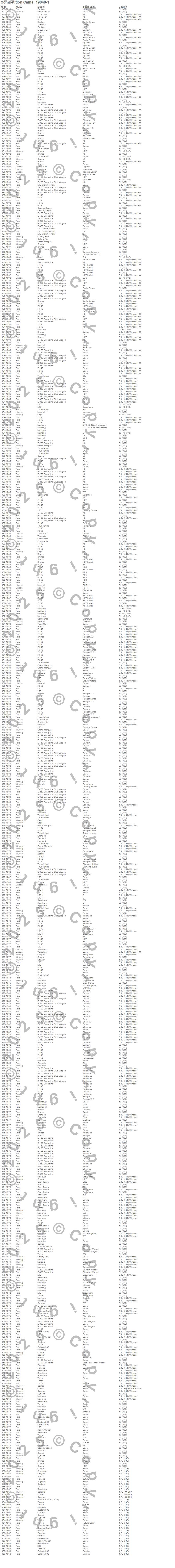 Bronco, Caliente, Capri, Club Cargo, Colony Park, Comet, Commuter, Continental, Cougar, Country Sedan, Country Squire, Custom, Custom 500, Cyclone, E Super Duty, E-100 Econoline, E-100 Econoline Club Wagon, E-150 Econoline, E-150 Econoline Club Wagon, E-200 Econoline more…