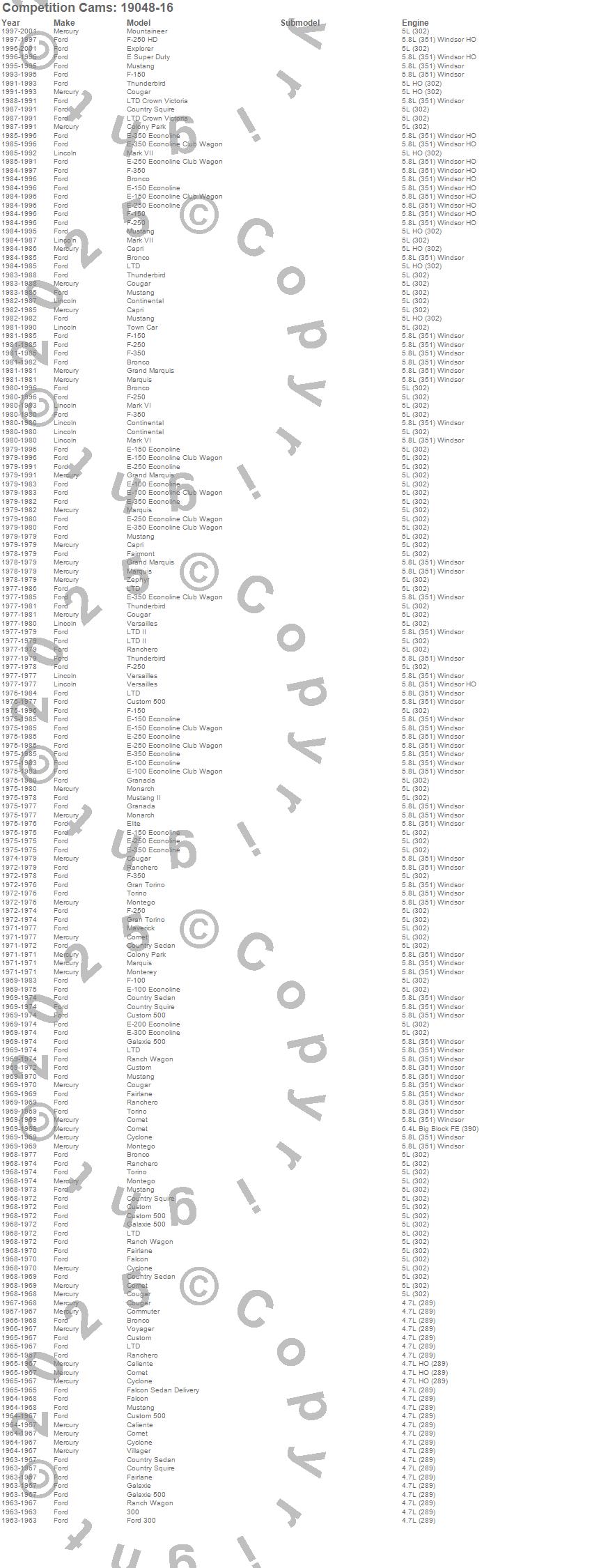 Bronco, Caliente, Capri, Club Cargo, Colony Park, Comet, Commuter, Continental, Cougar, Country Sedan, Country Squire, Custom, Custom 500, Cyclone, E Super Duty, E-100 Econoline, E-100 Econoline Club Wagon, E-150 Econoline, E-150 Econoline Club Wagon, E-200 Econoline more…