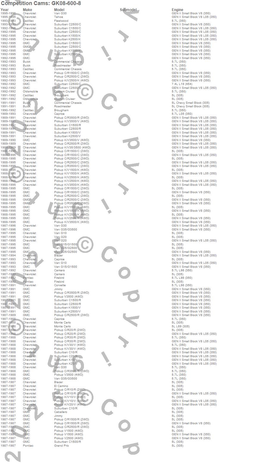 Blazer, Brougham, C1500, C1500 Pickup, C1500 Suburban, C2500 Pickup, C2500 Suburban, C3500 Pickup, Caballero, Camaro, Caprice, Commercial Chassis, Corvette, Custom Cruiser, El Camino, Firebird, Fleetwood, G10, G10 Van, G15/G1500 Van more…