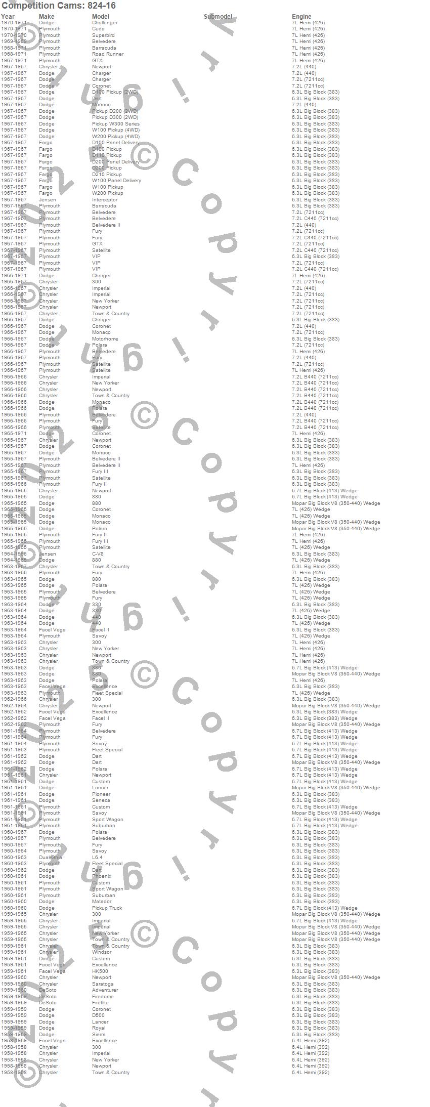 300, 330, 440, 880, Barracuda, Belvedere, Belvedere II, Challenger, Charger, Coronet, Cuda, Custom, D100 Pickup, D200 Series, D300 Series, Dart, Fleet Special, Fury, Fury II, Fury III more…