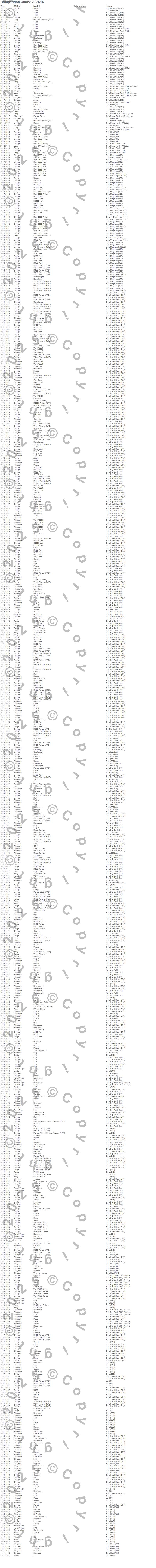 300, 330, 440, 880, B100 Van, B200 Van, B300 Van, Barracuda, Belvedere, Belvedere II, CB300 Van, Challenger, Charger, Cordoba, Coronet, Cuda, Custom, D100 Pickup, D150 Pickup, D200 Pickup more…
