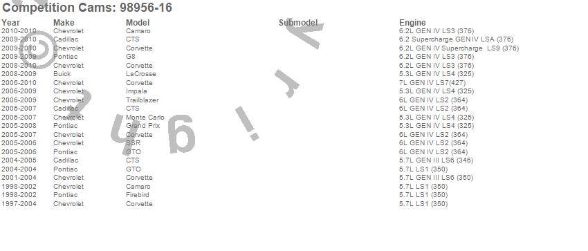 Below is an abreviated list of applications for the Elite Race Solid Roller Lifters.