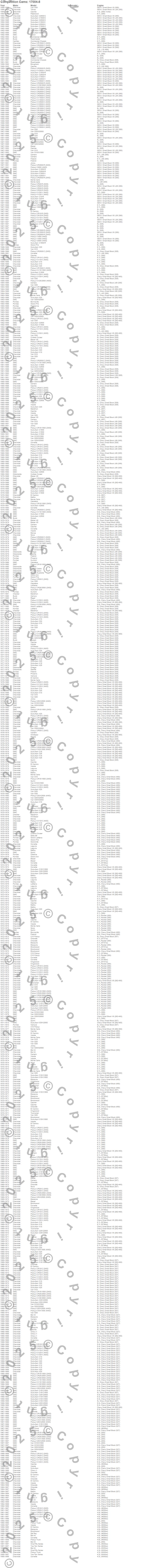 Bel Air, Biscayne, Blazer, Blazer K5, Bonneville, Brookwood, Brougham, C10 Pickup, C10 Suburban, C15 Suburban, C15/C1500, C15/C1500 Suburban, C1500, C1500 Pickup, C1500 Suburban, C20 Pickup, C20 Suburban, C25 Suburban, C25/C2500 Pickup, C25/C2500 Suburban more…