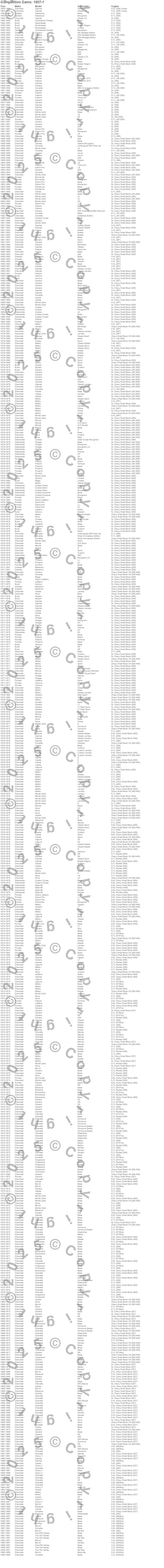 Bel Air, Biscayne, Bonneville, Brookwood, Brougham, Camaro, Caprice, Catalina, Century, Chevelle, Chevy II, Commercial Chassis, Corvette, Custom Cruiser, Cutlass, Cutlass Calais, Cutlass Cruiser, Cutlass Salon, Cutlass Supreme, Del Ray more…