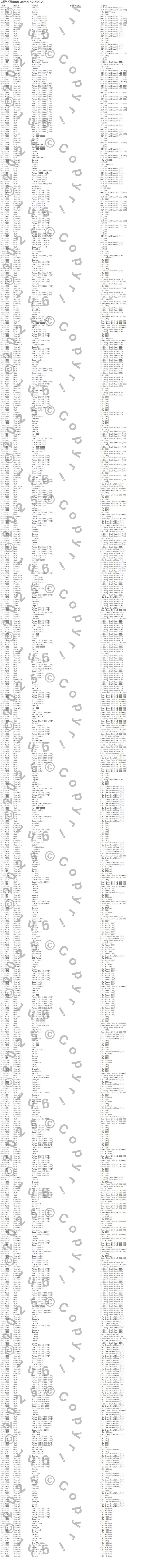 Bel Air, Biscayne, Blazer, Blazer K5, Bonneville, Brookwood, Brougham, C10 Pickup, C10 Suburban, C15 Suburban, C15/C1500, C15/C1500 Suburban, C1500, C1500 Pickup, C1500 Suburban, C20 Pickup, C20 Suburban, C25 Suburban, C25/C2500 Pickup, C25/C2500 Suburban more…