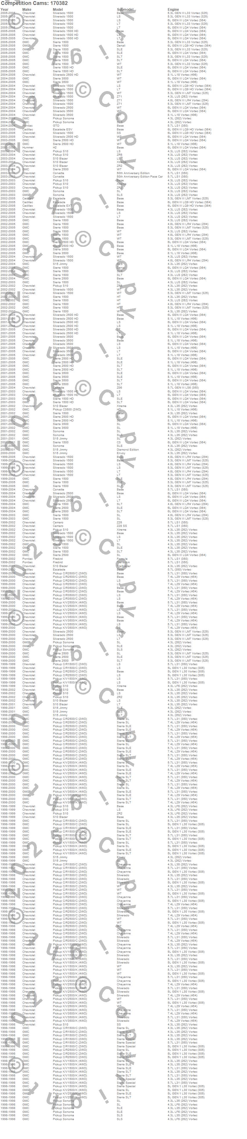 C1500 Pickup, C2500 Pickup, C3500 Pickup, Camaro, Corvette, Escalade, Escalade ESV, Escalade EXT, Firebird, GTO, H2, K1500 Pickup, K2500 Pickup, K3500 Pickup, S10 Blazer, S10 Blazer (Canadian), S10 Pickup, S15 Jimmy, Sierra 1500, Sierra 1500 HD more…
