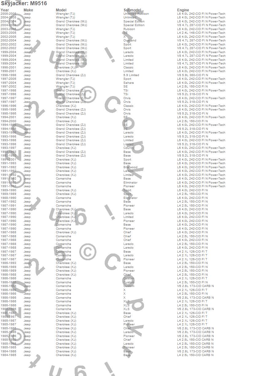 Cherokee (XJ), Comanche, Grand Cherokee (WJ), Grand Cherokee (ZJ), Wrangler (LJ), Wrangler (TJ), Jeep, 2005, 2004, 2003, 2002, 2001, 2000, 1999, 1998, 1997, 1996, 1995, 1994, 1993 more…