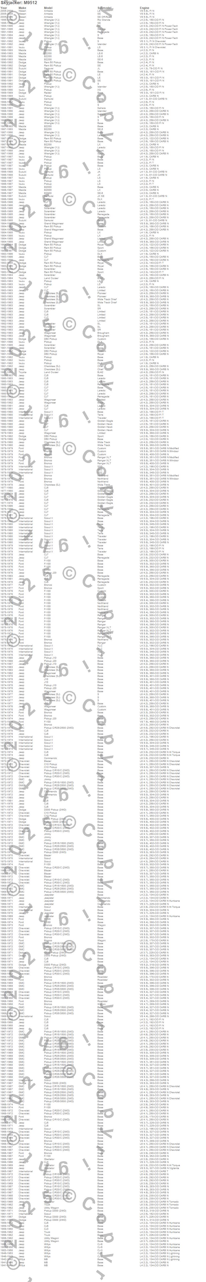 Armada, B2000, B2200, Blazer, Bronco, C10 Pickup, C15/C1500, C20 Pickup, C25/C2500 Pickup, C30 Pickup, C35/C3500 Pickup, Cherokee (SJ), CJ-2A, CJ-3A, CJ-3B, CJ3, CJ5, CJ6, CJ7, D300 Pickup more…