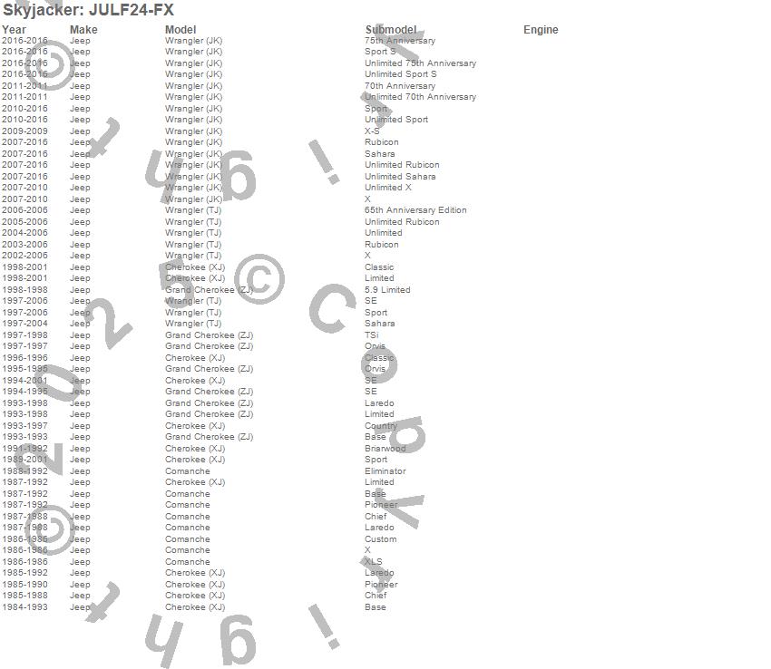 Cherokee (XJ), Comanche, Grand Cherokee (ZJ), Wrangler (TJ), Jeep, 2001, 2000, 1999, 1998, 1997, 1996, 1995, 1994, 1993, 1992, 1991, 1990, 1989, 1988, 1987 more…