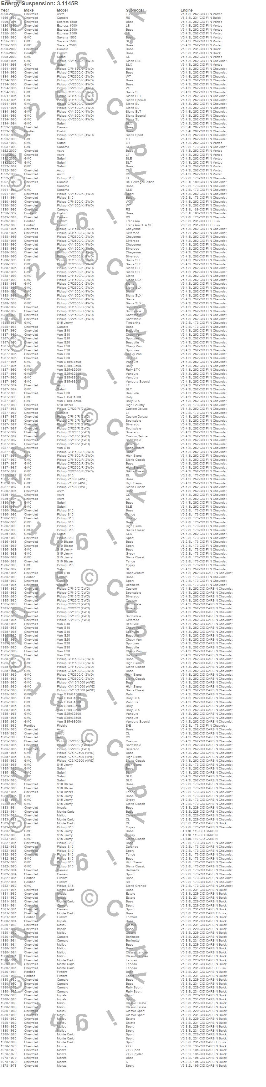 Astro, C10 Pickup, C1500, C1500 Pickup, C20 Pickup, C2500 Pickup, Camaro, Express 1500, Express 2500, Firebird, G10 Van, G15/G1500 Van, G20 Van, G25/G2500 Van, G30 Van, G35/G3500 Van, Impala, K10 Pickup, K1500, K1500 Pickup more…