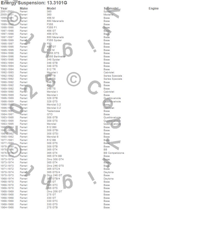275 GT, 275 GTB, 308 GTB, 308 GTBi, 308 GTS, 308 GTSi, 328 GTB, 328 GTS, 330 GT, 330 GTC, 330 GTS, 348 GTB, 348 GTS, 348 Spider, 348 TB, 348 TS, 360, 365 GT, 365 GT4, 365 GT4 BB more…